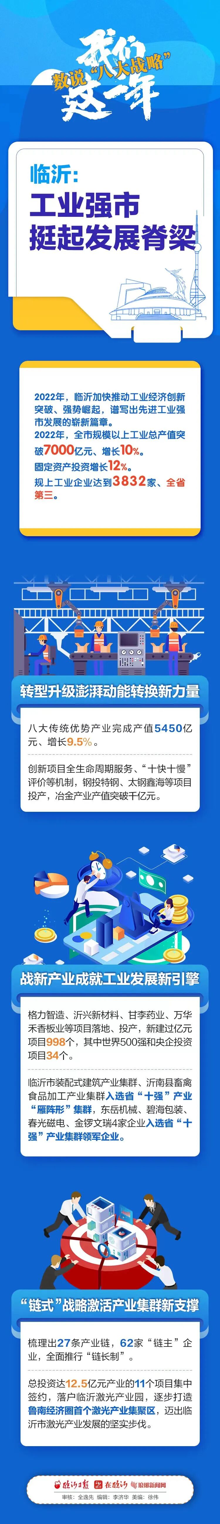 数据见证成绩:2022年临沂规模以上工业总产值突破7000亿元,增长10%;八大传统产业完成产值5450亿元,增长9.5%;格力智造、万华禾香板业等项目落地、投产,新建过亿元项目998个,其中世界500强和央企投资项目34个……一个个数据,一项项成绩,彰显着加快工业发展的探索与实践,挺起沂蒙革命老区走在前的“硬脊梁”。